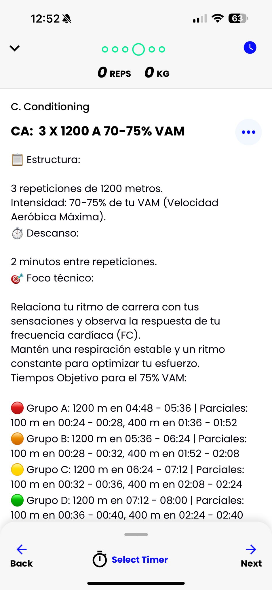 El entreno de cada día, con su bloque de calentamiento, su explicación en cada ejercicio sobre cuál es la intención, escala de esfuerzo, tempo.. cualquier detalle que es relevante para realizar un ejercicio.